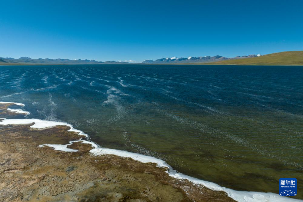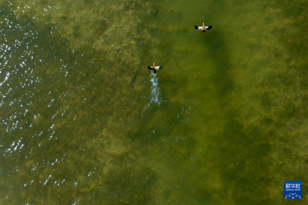 飛鳥從打加錯(cuò)湖面掠過(無人機(jī)照片,8月30日攝)。新華社發(fā)(旦增努布 攝)