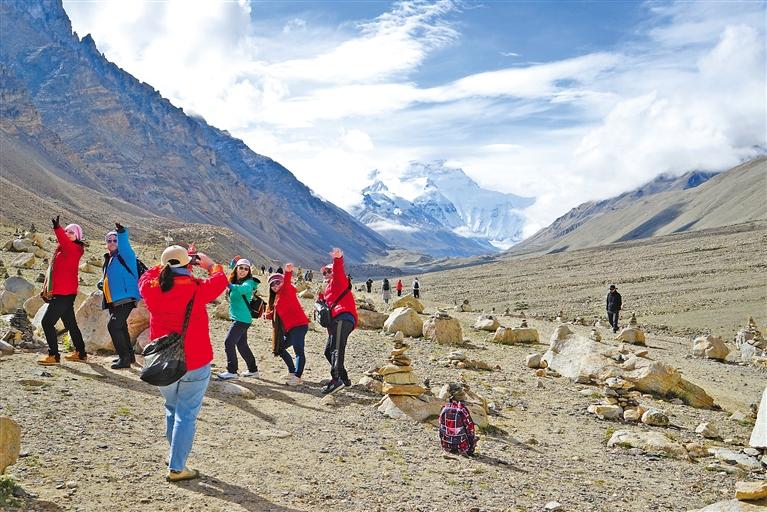 圖為游客在珠峰大本營(yíng)景區(qū)拍照留念。 記者 益西加措 攝