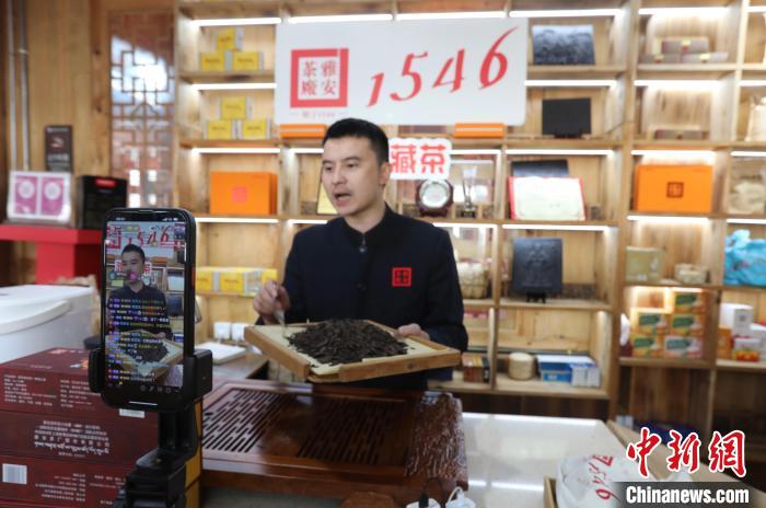 9月14日,四川省雅安茶廠(chǎng)內(nèi),工作人員正在直播介紹藏茶。中新網(wǎng)記者 王磊 攝
