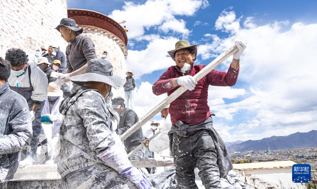 工作人員對布達拉宮外墻噴灑涂料(10月18日攝)。新華社記者 晉美多吉 攝