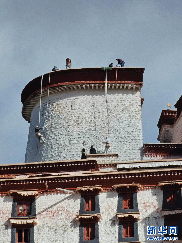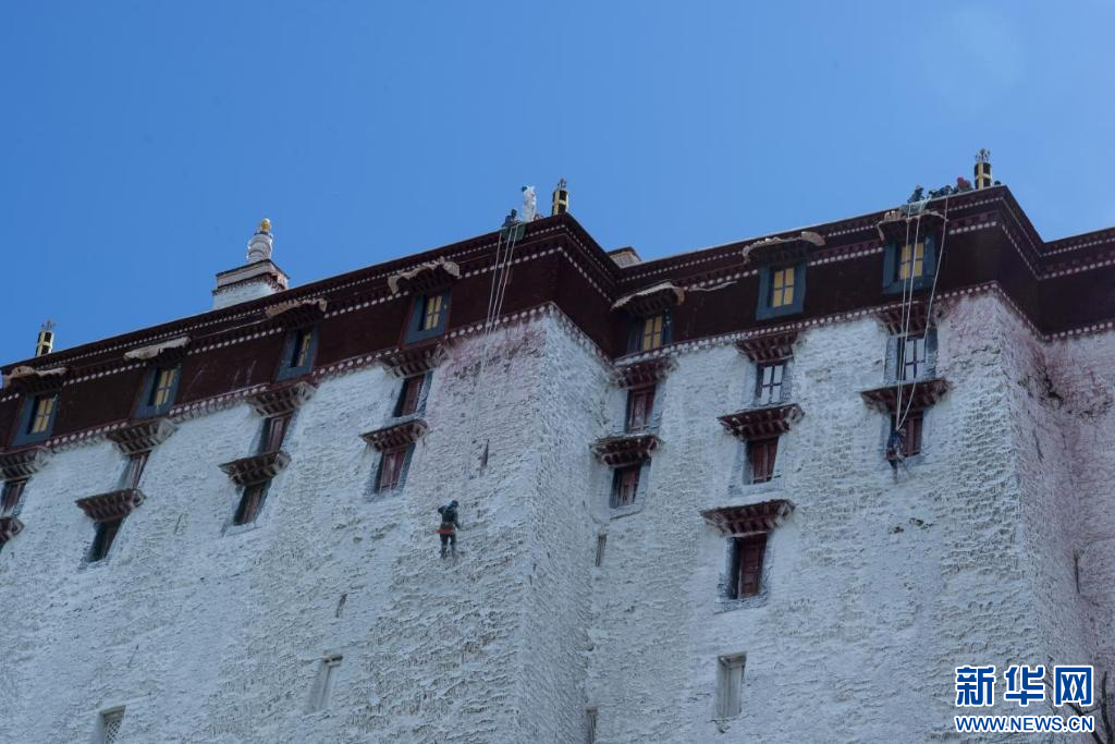10月18日,布達(dá)拉宮“美容師”們?cè)趪姙⑼鈮?。新華網(wǎng) 柑丹鴦琦 攝