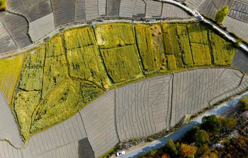 錯落有致的金色稻田,呈現(xiàn)出一派豐收的景象。