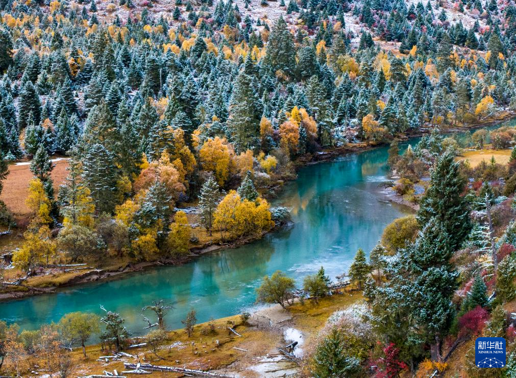 時值金秋,西藏林芝市秋色已濃,黃葉與初雪交織,流水并雪山輝映,景色如詩如畫。
