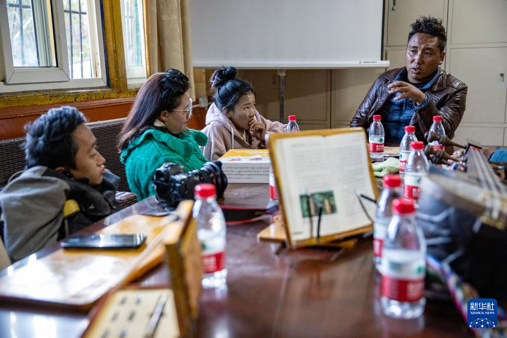 西藏拓崗文化傳播有限公司負(fù)責(zé)人覺列(右一)在直播前與直播團(tuán)隊(duì)討論直播方案(11月10日攝)。新華社記者 姜帆 攝 ??