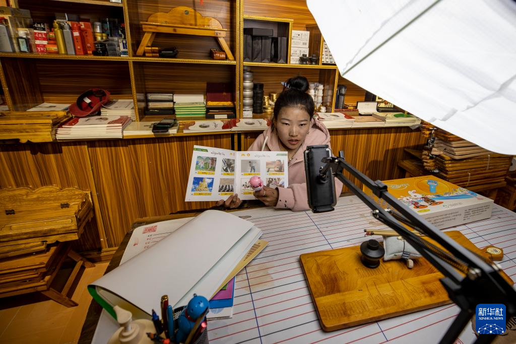 西藏拓崗文化傳播有限公司主播索朗德吉在直播銷售藏語(yǔ)學(xué)習(xí)文具(11月10日攝)。新華社記者 姜帆 攝