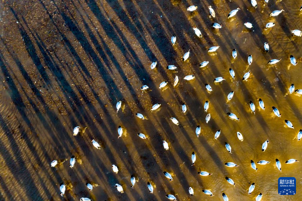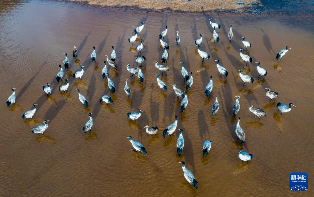 這是12月5日清晨在拉薩市林周縣虎頭山水庫拍攝的越冬黑頸鶴(無人機照片)。新華社記者 姜帆 攝