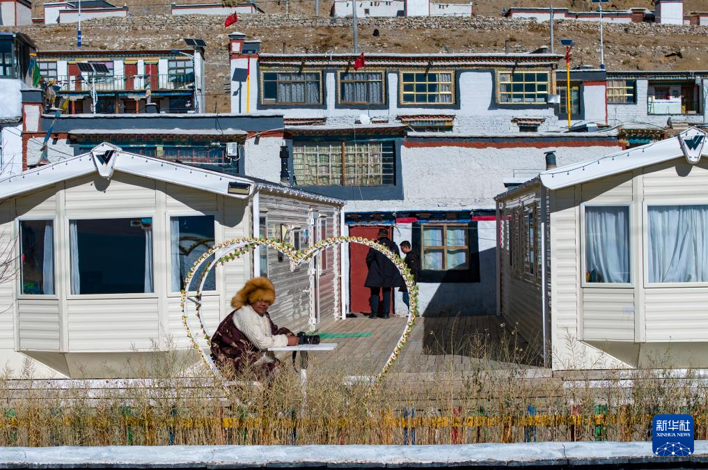 尼瑪縣文部鄉(xiāng)文部南村村民尼瑪扎巴坐在自己的“太空艙旅店”的椅子上(無人機(jī)照片,12月20日攝)。新華社記者 格桑朗杰 攝