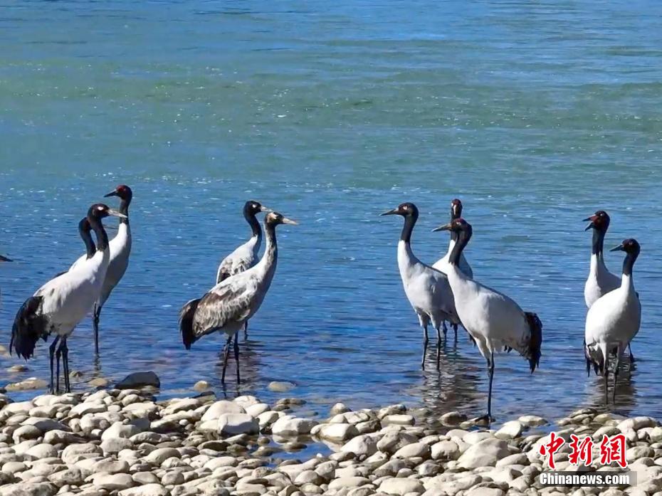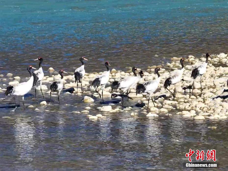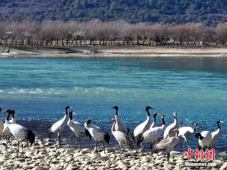 圖為黑頸鶴在雅魯藏布江畔覓食、嬉戲。索次 攝