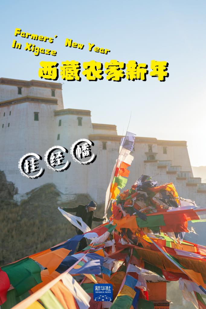 農(nóng)家新年大年初三,日喀則市桑珠孜區(qū)藏族群眾沿襲傳統(tǒng),清晨在山頂和自家屋頂上豎起嶄新的經(jīng)幡,祈愿新的一年國泰民安(1月14日攝)?! ?/p>