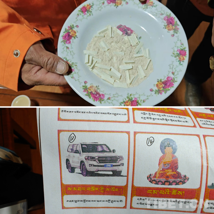 為了增添一些節(jié)日的氣氛,幾位道班大哥為我們準(zhǔn)備了別具特色的“抽簽”式古突。大家從盤子里抽取印有數(shù)字的標(biāo)簽紙,然后根據(jù)數(shù)字從解析書里找出對應(yīng)的圖案和文字解釋,寓意著新年會有不同的收獲。兩位同事抽到了取火器和黃財神,解讀說是能干和發(fā)大財。而我抽到了一輛“霸道車”,道班大哥說意味著新的一年我能去周游世界。每抽完一個簽,大家都會叫好和鼓掌,給抽簽人送去美好的新年祝福。