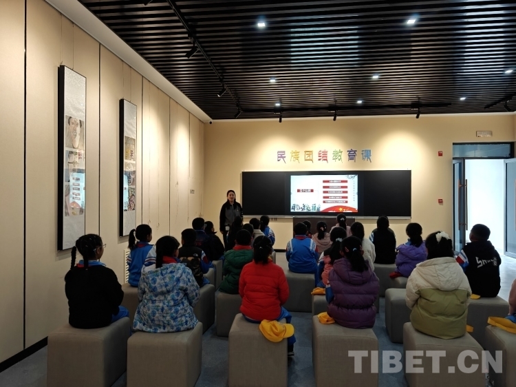 圖為開(kāi)館儀式當(dāng)天,當(dāng)?shù)貙W(xué)生在展館內(nèi)上民族團(tuán)結(jié)教育課
