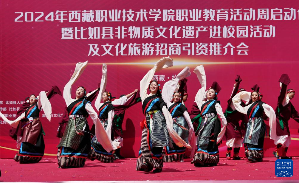 當(dāng)日,西藏職業(yè)技術(shù)學(xué)院職業(yè)教育活動周在拉薩啟動,那曲市比如縣民族藝術(shù)團非物質(zhì)文化遺產(chǎn)表演暨“鄉(xiāng)村振興 那曲奮進”旅游推介走進校園,激發(fā)人們對傳統(tǒng)文化和特色旅游的興趣?! ??