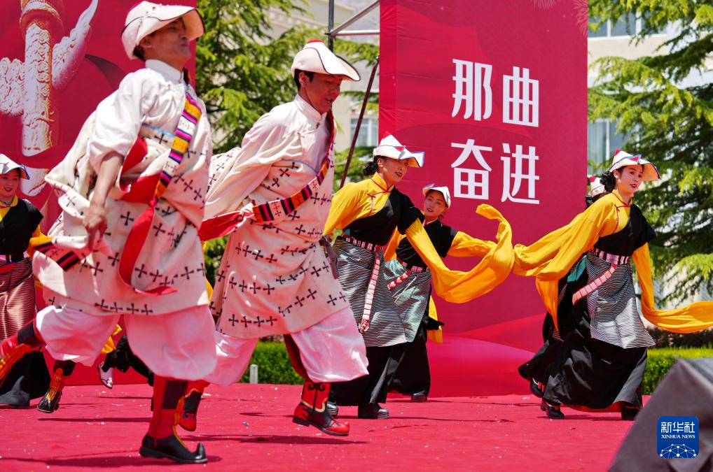 5月12日,在西藏職業(yè)技術(shù)學(xué)院職業(yè)教育活動周啟動儀式暨比如縣非物質(zhì)文化遺產(chǎn)進校園活動上,比如縣民族藝術(shù)團的演職人員在表演節(jié)目。新華社發(fā)(趙大志攝) ??