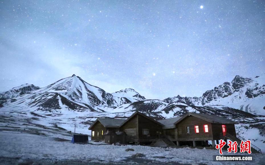 近日,記者嘗試攀登了白雪皚皚的青海省海北藏族自治州門源回族自治縣境內的崗什卡雪峰。崗什卡雪峰面積約450平方公里,又稱“冷龍嶺”,是祁連山主峰之一,海拔在4000米—5000米之間,海拔4500米以上多有現代冰川,冰川總面積約80平方公里。圖為晚間的崗什卡雪峰露營基地。陳宏年 攝