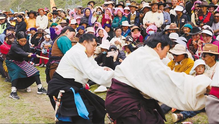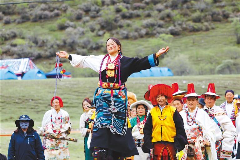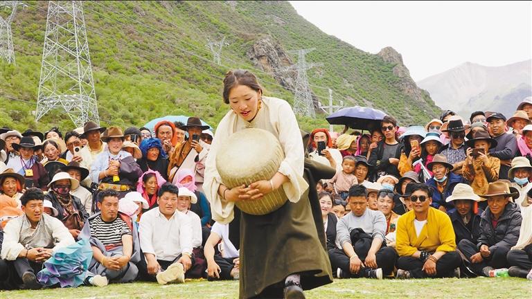 開幕式在藏雄村幼兒園小朋友表演的舞蹈《第一支花》中拉開序幕,唐古鄉(xiāng)、阿朗鄉(xiāng)、旁多鄉(xiāng)對(duì)北部三鄉(xiāng)獨(dú)特的文化藝術(shù)、生態(tài)環(huán)境以及豐富的“非遺”文化進(jìn)行展示與推介,還有特色服飾展演,他們將秀場搬到大自然,以“傳統(tǒng)民族服飾走秀+‘非遺’文化展示+牧區(qū)生活用具展示”為核心,配以林周縣唐古鄉(xiāng)關(guān)于北部三鄉(xiāng)服飾的唱頌詞與鼓點(diǎn)相融合,為展演提供了獨(dú)特的音樂伴奏,展現(xiàn)了林周縣北部三鄉(xiāng)豐富的民族文化。