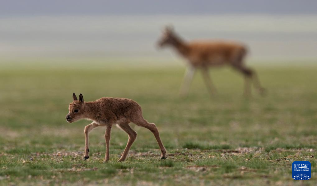 6月17日,在魯確塘草原,一只剛出生不久的小藏羚羊跟著母藏羚羊在草原上漫步。新華社記者 費茂華 攝