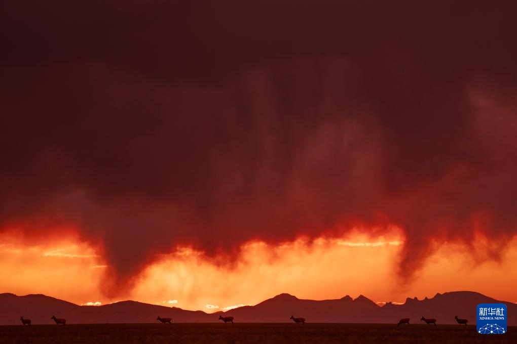 晚霞中待產(chǎn)的藏羚羊(6月16日攝)。新華社記者 費茂華 攝