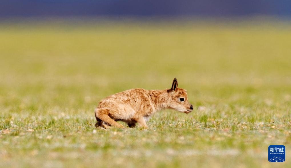 6月17日,在魯確塘草原,一只剛出生不久的小藏羚羊在草地上奔跑。新華社記者 費茂華 攝??