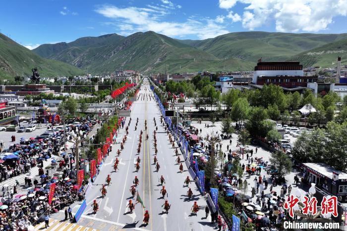 當(dāng)日,來自玉樹州一市五縣的數(shù)千名康巴藏族兒女身著盛裝,載歌載舞,以行走巡演方式展示玉樹豐富多彩的非物質(zhì)文化遺產(chǎn)。近兩小時(shí)的巡游,吸引了眾多省內(nèi)外游客和當(dāng)?shù)馗髯迦罕妸A道觀賞。