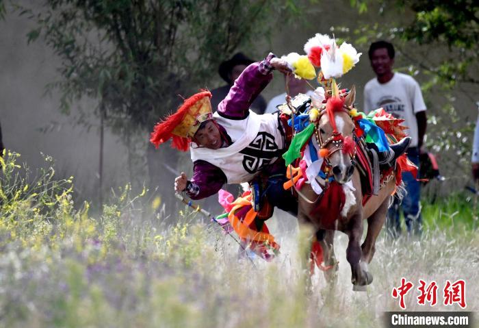 7月27日,西藏拉薩市桑達(dá)村迎來“望果節(jié)”,村民們舉行賽馬活動(dòng)慶祝。“望果節(jié)”是西藏傳統(tǒng)的豐收節(jié),具體日期隨各地莊稼成熟的時(shí)間而變化?!巴?jié)”期間,按照習(xí)俗,各地都會(huì)舉辦賽馬比賽。圖為騎手進(jìn)行馬術(shù)表演。中新社記者 李林 攝