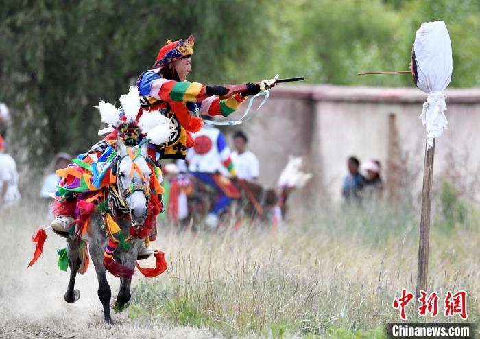 7月27日,西藏拉薩市桑達(dá)村迎來“望果節(jié)”,村民們舉行賽馬活動(dòng)慶祝?!巴?jié)”是西藏傳統(tǒng)的豐收節(jié),具體日期隨各地莊稼成熟的時(shí)間而變化?!巴?jié)”期間,按照習(xí)俗,各地都會(huì)舉辦賽馬比賽。圖為騎手進(jìn)行馬上射擊表演。中新社記者 李林 攝