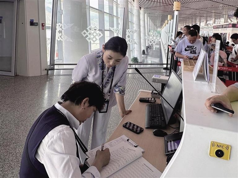 日常工作中,達娃曲珍也會發(fā)揮自己的語言優(yōu)勢,為藏族旅客提供幫助?!坝行┘亦l(xiāng)人確實不太會講普通話,用方言進行交流會讓他們覺得很親切,溝通過程也會順暢很多。”達娃曲珍還主動學習英語,掃清與外國游客的溝通障礙。常用服務用語的熟練掌握,為她更好地服務旅客打下了堅實基礎。