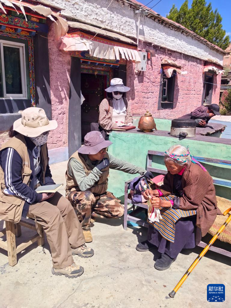 普查隊員在山南市曲松縣曲松鎮(zhèn)瓊嘎村向當(dāng)?shù)乩先俗稍冊摯鍤v史文化情況。(受訪者供圖)