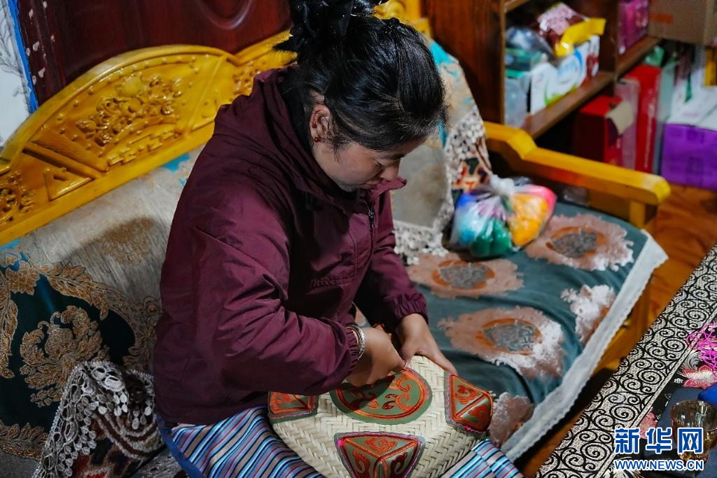 次仁卓瑪在用彩線裝飾竹筐(9月5日攝)。 新華網(wǎng)發(fā) 喬柯嵐 攝