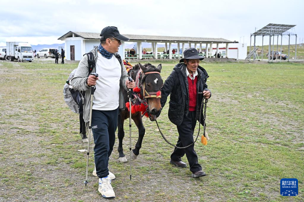 9月8日,在普蘭縣巴嘎鄉(xiāng)崗莎村,當(dāng)?shù)卮迕裾隣恐R和游客同行。新華社記者孫瑞博 攝