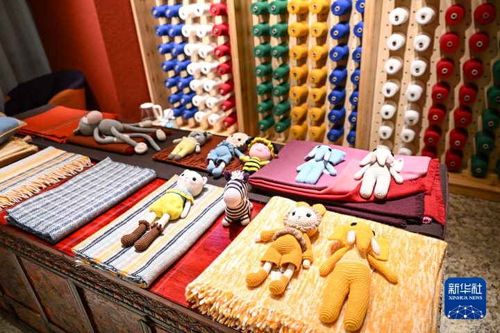 在西藏日喀則市一間門(mén)店拍攝的玩偶、圍巾、披肩等江孜氆氌產(chǎn)品。新華社記者孫瑞博 攝