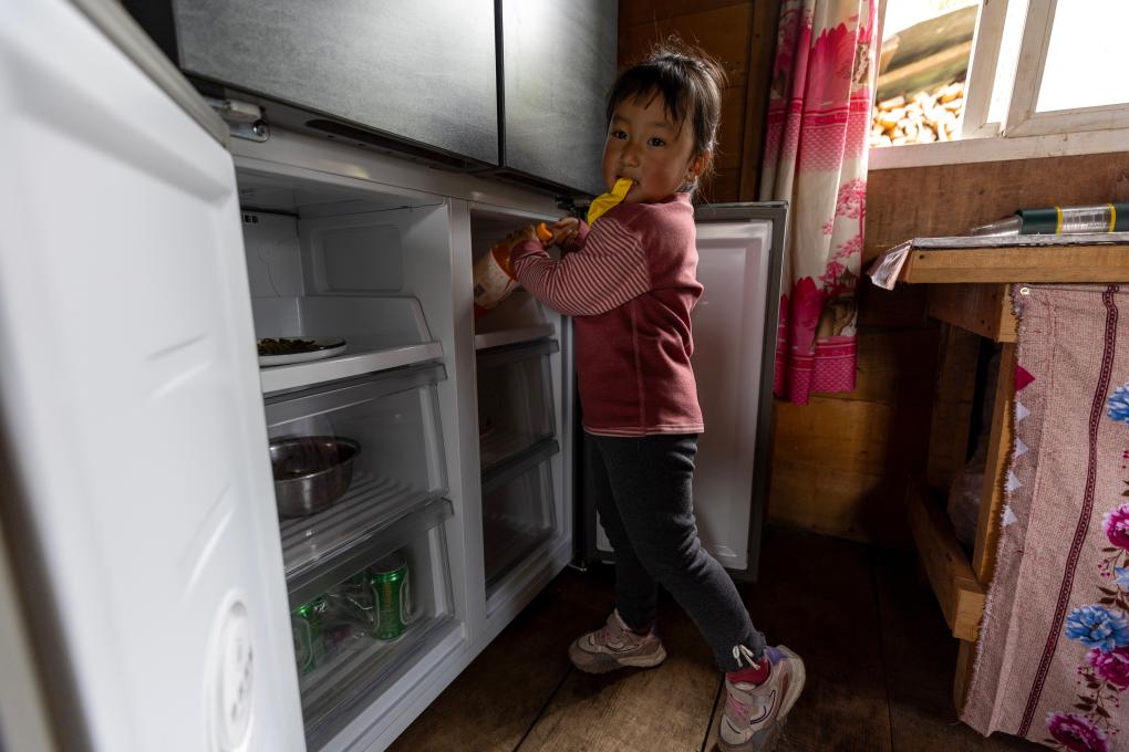 墨脫縣達(dá)木珞巴民族鄉(xiāng)達(dá)木村4歲的小朋友次仁拉姆從自家冰箱中取出飲料待客(4月25日攝)。新華社記者 姜帆 攝