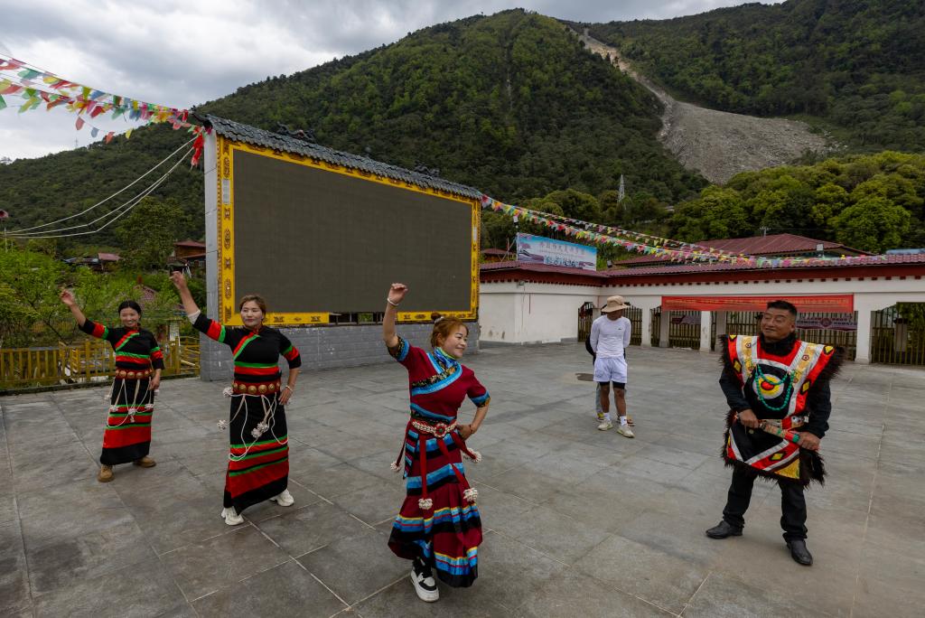 索朗(右一)在村里的廣場上指導(dǎo)年輕一代跳“刀舞”(4月25日攝)。新華社記者 姜帆 攝