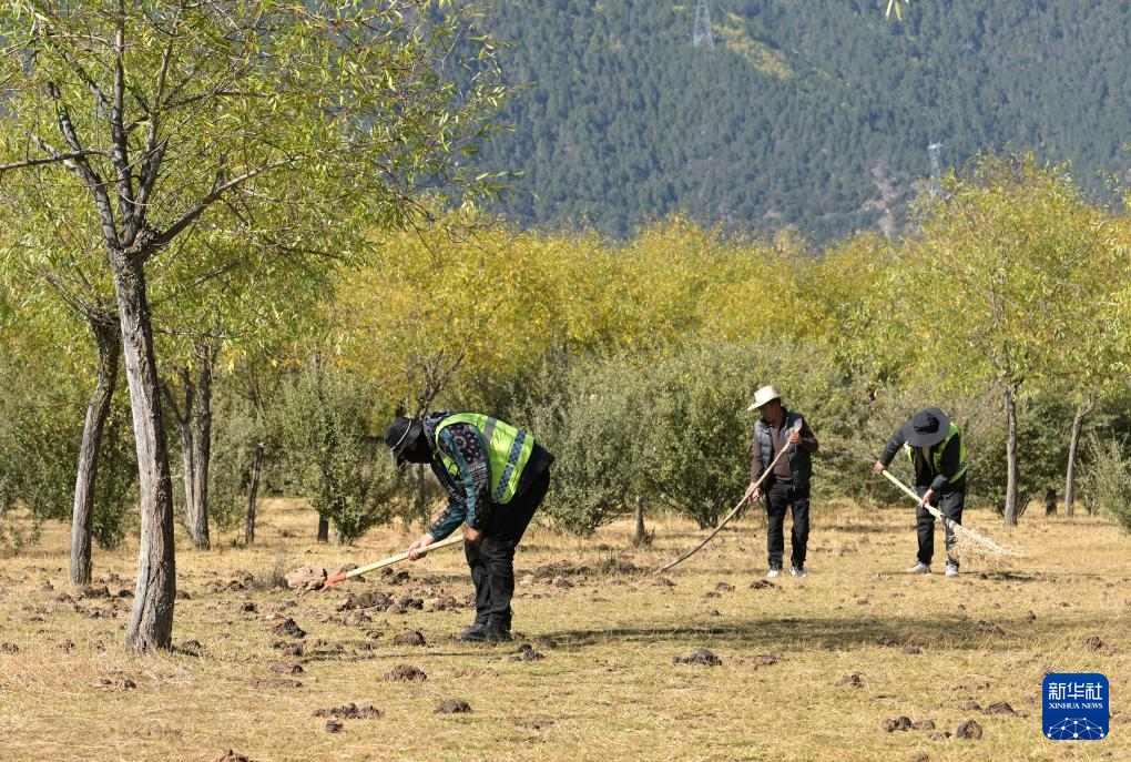 在西藏林芝雅尼國家濕地公園內(nèi),濕地管護隊員們進行每日的例行清理維護(10月24日攝)。新華社記者 李賀 攝??