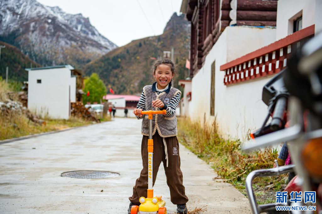 10月19日,小朋友在昌都市卡若區(qū)妥壩鄉(xiāng)熱霍村整潔的道路上玩耍。新華網 旦增努布 攝
