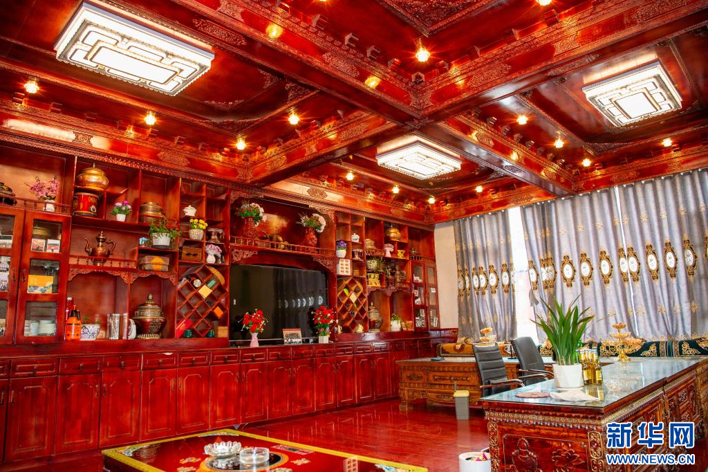 10月14日,昌都市左貢縣旺達鎮(zhèn)兵達村村民貢布普措在介紹自家裝飾。新華網 旦增努布 攝