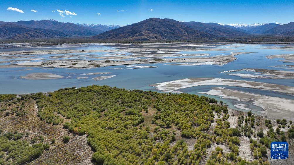 這是雅魯藏布江寬闊的河床和岸邊種植的樹木(2024年10月24日攝,無人機(jī)照片)。新華社記者 晉美多吉 攝 ??