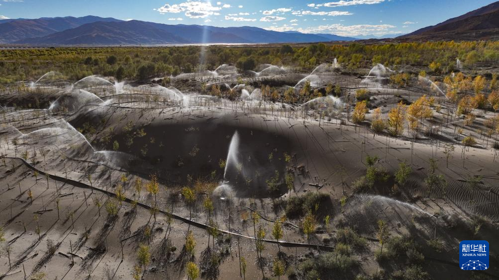 在雅魯藏布江畔,自動灌溉設(shè)備給樹木澆水(2024年10月24日攝,無人機(jī)照片)。新華社記者 晉美多吉 攝 ??