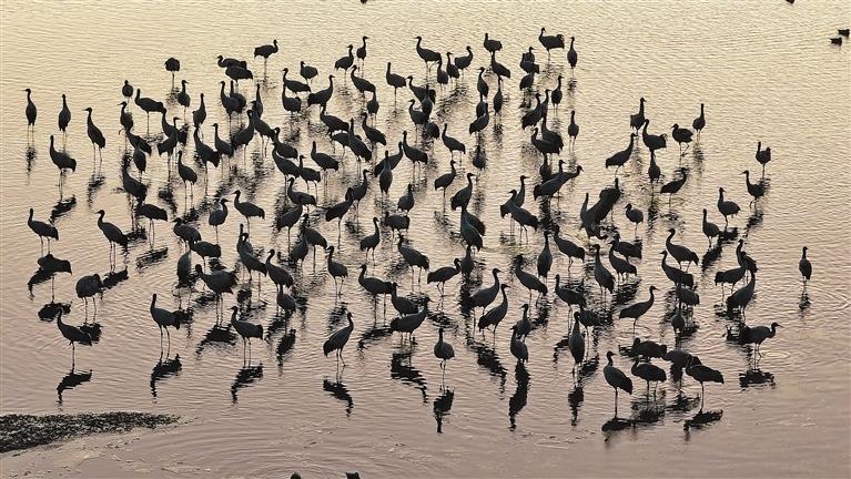 黑頸鶴是全球15種鶴類中唯一在高原地區(qū)生活、繁殖的鶴類,屬國家一級保護動物。每年10月中下旬,大批黑頸鶴從藏北高原飛到拉薩河谷,它們在農(nóng)田、沼澤地里覓食嬉戲,享受冬日暖陽?!?/p>