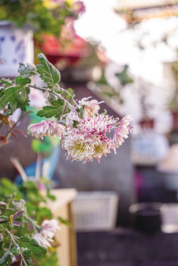 走進八廓街、穿過繁華的大昭寺廣場,沿著古巷小路便能來到貢桑孜大院。邁入大院,首先映入眼簾的是獨具韻味的傳統(tǒng)藏式建筑風格,白墻、紅頂、黑窗沿,陽光滲過在微風中飄動的“香布”,稀稀散散地落在精美的木雕窗花上,襯得陽臺木制立柱上的花紋分外醒目。各式花卉與居民生活用品一同擺放在四四方方的院落中,卻并不顯得擁擠,反而增添了一絲浪漫的煙火氣。