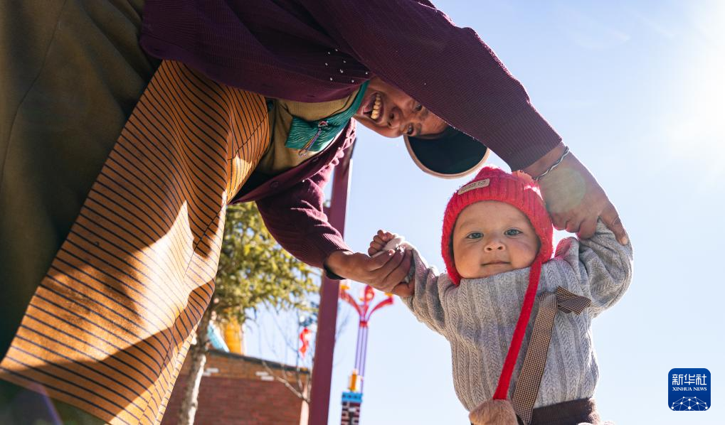 12月15日,達(dá)曼新村的一名婦女在教孩子走路。新華社記者 丁增尼達(dá) 攝 ??