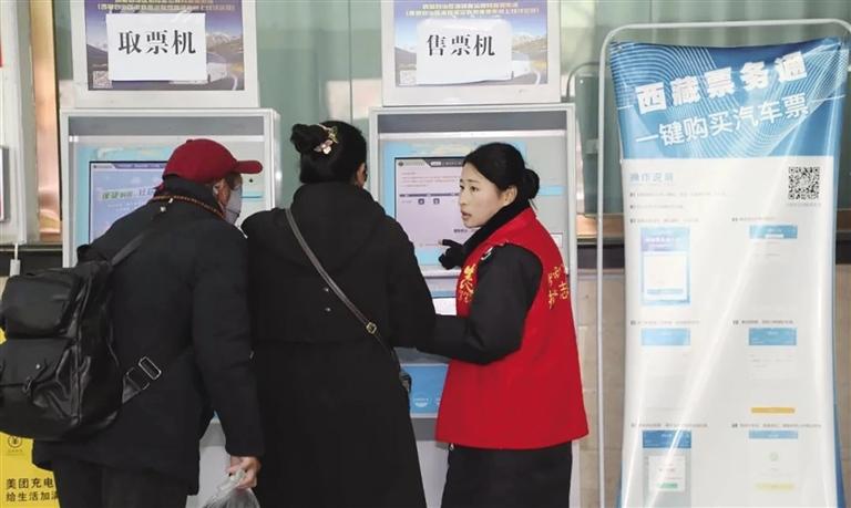 志愿者幫助旅客自助購票。圖由西藏自治區(qū)交通運(yùn)輸廳提供