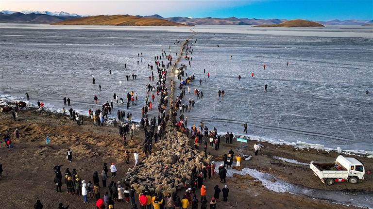 2月7日凌晨,西藏山南市浪卡子縣打隆鎮(zhèn)推瓦村旁的普莫雍措湖面上,夜色未退,一群村民打著手電筒,沿著用牛糞灰鋪就的冰路,穩(wěn)步將數(shù)百只羊趕往湖心島。這一延續(xù)千年的“冰湖趕羊”傳統(tǒng),是當(dāng)?shù)啬撩衽c自然和諧共處的智慧碩果,也承載著普莫雍措獨(dú)特的歷史記憶。在這里,冰面的湛藍(lán)裂紋、牧羊人的質(zhì)樸堅(jiān)守與游客的由衷贊嘆相互交融,共同講述著有關(guān)生存、傳承和敬畏自然的故事?!霸诟篙?、祖輩那時(shí)候,羊群是村民們賴以生存的根本;如今,趕羊活動(dòng)帶來(lái)的旅游熱潮依然是大家維持生計(jì)的重要支撐。所以,我想跟推瓦村的年輕人說(shuō),一定不要忘記這項(xiàng)傳統(tǒng),不要舍棄這些給我們帶來(lái)富足生活的羊群。”伍金旦增滿懷深情地說(shuō)道。