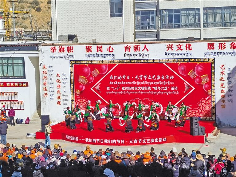 由日喀則市文旅局主辦、日喀則市群眾藝術(shù)館承辦的“我們的節(jié)日·元宵節(jié)文藝演出活動(dòng)暨‘1+3’意識新時(shí)代文明實(shí)踐‘暖冬六送’活動(dòng)”,在日喀則市群眾藝術(shù)館院內(nèi)舉行?;顒?dòng)在舞蹈《阿吉朗薩》中溫暖開場,《歡樂日喀則》《心中的祝?!贰吨袊鴫簟返裙?jié)目掀起了活動(dòng)的高潮,觀眾們手中揮舞的五星紅旗表達(dá)了對祖國母親的熱愛之情和對幸福生活的感恩之情。