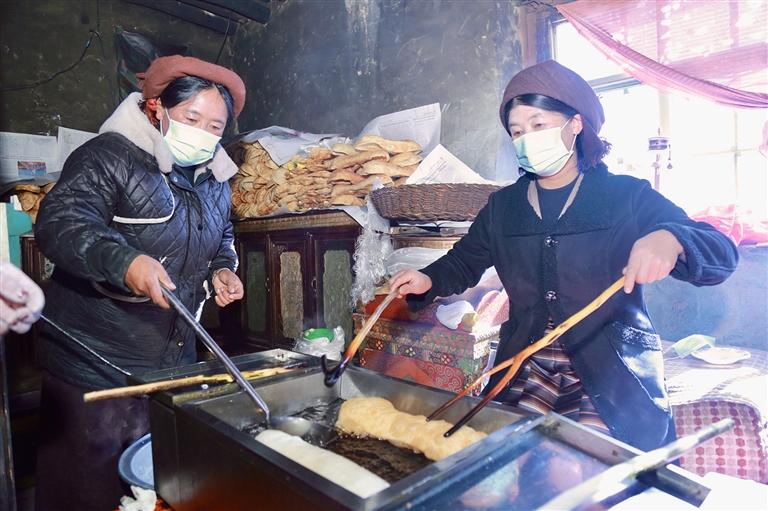 “德卡”,作為傳統(tǒng)藏式點心“卡塞”的一種,在藏歷新年的年貨清單里占據(jù)著不可或缺的位置。每到藏歷新年前夕,旦索朗一家便進入了一年中最忙碌的時段——經(jīng)營起制作和售賣卡塞的生意。旦索朗回憶起小時候的新年,感慨萬分:“小時候過年,家家戶戶都自己炸卡塞,那時候,整個村子都被卡塞的濃香包圍著。現(xiàn)在生活條件好了,很多人覺得在外購買德卡更方便省事,這也給我們帶來了商機。我們做炸德卡的生意已經(jīng)6年了,一直都很受歡迎,還帶動了6名村民一起參與,增加了大家的收入?!?/p>