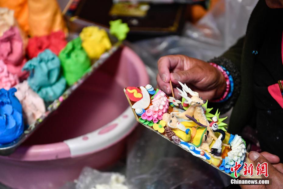 2月15日,手工藝人在拉薩制作酥油花。隨著藏歷新年臨近,酥油花在拉薩年貨市場上熱銷。酥油花在藏語中稱為“孜扎”,是藏族民眾家庭中必備的年貨之一。中新社記者 貢嘎來松 攝