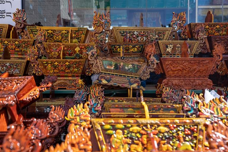 “老板,這個(gè)切瑪盒多少錢?便宜點(diǎn)我就拿走了?!薄斑@個(gè)圖案樣式都是精心雕刻的,最低1300元,實(shí)在不能再少了。”次仁的店鋪前,不少顧客正在挑選“切瑪盒”,生意很是火爆?!扒鞋敽小笔菍⒕贫沸文竞杏酶舭宸珠_,左右兩邊分別盛入炒青稞和糌粑,再插上象征五谷豐登的“羅薩梅朵”和寓意吉祥的酥油花,寓意人壽年豐、吉祥如意,是藏歷新年家家戶戶必備的年貨之一。次仁告訴記者,“切瑪盒”根據(jù)圖案、顏料、大小、木材等因素,售價(jià)從幾百元到上千元不等,很多顧客普遍喜愛傳統(tǒng)樣式與圖案。