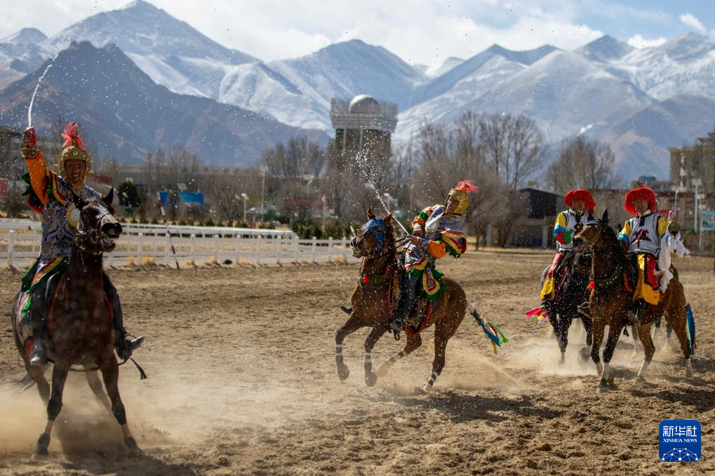 3月2日,馬術(shù)隊員在重現(xiàn)馬球比賽場景。新華社記者 晉美多吉 攝