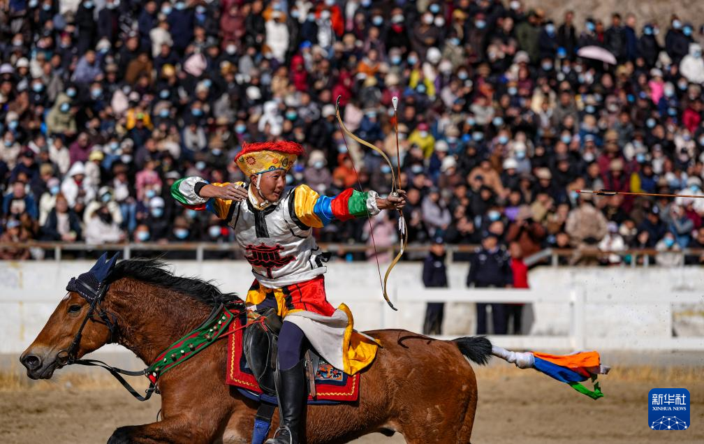 3月2日,馬術(shù)隊員在表演傳統(tǒng)馬術(shù)項目馬上射箭。新華社記者 晉美多吉 攝??