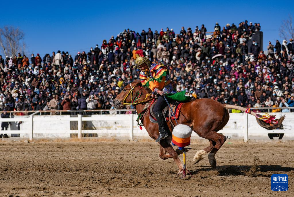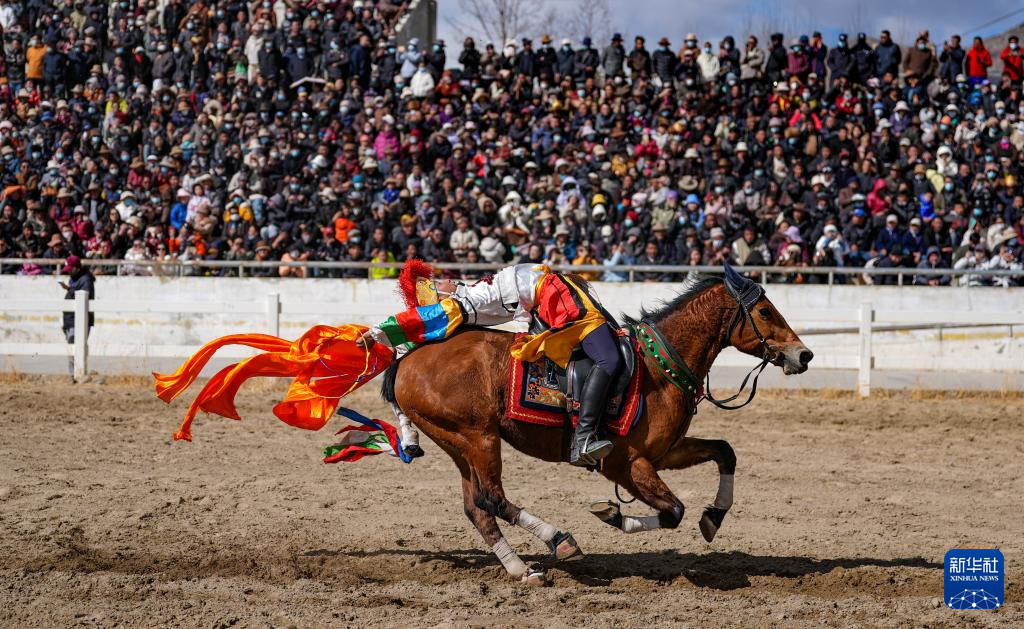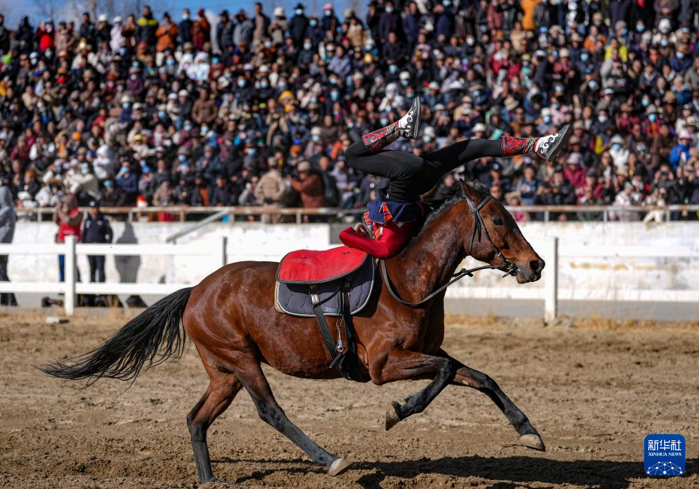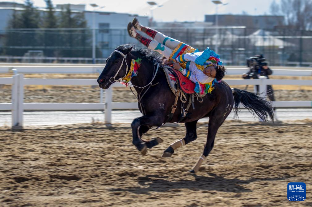 3月2日,馬術(shù)隊員在表演傳統(tǒng)馬術(shù)項目撿哈達(dá)。新華社記者 晉美多吉 攝?