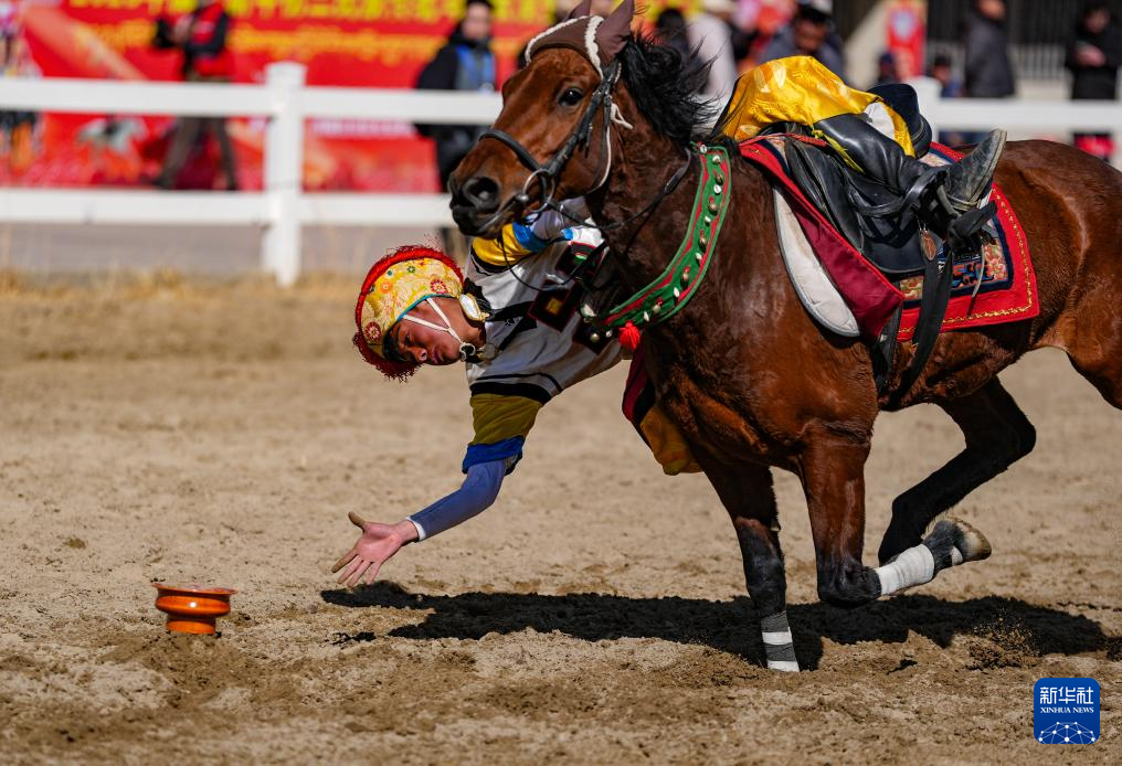 3月2日,馬術(shù)隊員在表演傳統(tǒng)馬術(shù)項目撿碗。新華社記者 晉美多吉 攝??
